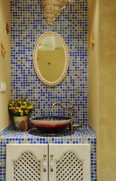 在地中海風(fēng)格裝修中,馬賽克主要應(yīng)用于衛(wèi)生間,藍(lán)色漸變的小瓷磚和其他顏色的小瓷磚拼貼在一起,搭配著黃色墻上的小海星和大海螺,有沒有給人一種仿佛就在海岸邊的感覺呢?