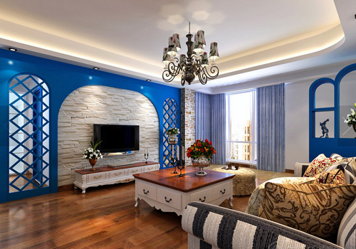 在地中海風(fēng)格中,無論是房屋還是家居的線條,絕不是拘泥于傳統(tǒng)直來直往的線條。獨(dú)特的渾圓造型,更顯自然。唯美復(fù)古的鐵藝吊燈,雪白的墻壁仿佛是被水沖刷過一樣,“?!钡奈邓{(lán)和“天”的潔白相結(jié)合,明亮的色彩與紅棕色的地板、桌面及土黃色的抱枕和坐凳交織在一起,將地中海風(fēng)格中強(qiáng)烈的民族色彩描繪的淋漓盡致。
