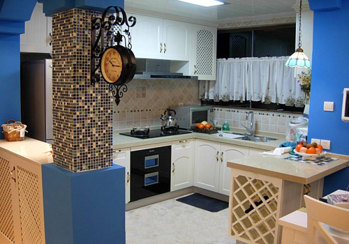 自然的原木、天然的石材是這間開放式廚房的主要裝飾材料,吊頂柜的設(shè)計(jì),充分地利用了廚房的每一寸空間,不僅不會顯得局促,反而更顯大方大氣。造型獨(dú)特的掛鐘,是地中海風(fēng)格獨(dú)特的美學(xué)產(chǎn)物。家居柔和自然的色彩,簡潔輕快的線條裝飾,帶著濃濃的純樸氣息,縱然時光流逝,日久彌新。馬賽克拼接的羅馬柱成為了廚房中的一個看點(diǎn),讓充斥著古樸味道的廚房中帶來了一絲華麗,這種拼接藝術(shù)裝飾,是地中海風(fēng)格中較為重要的一種元素。