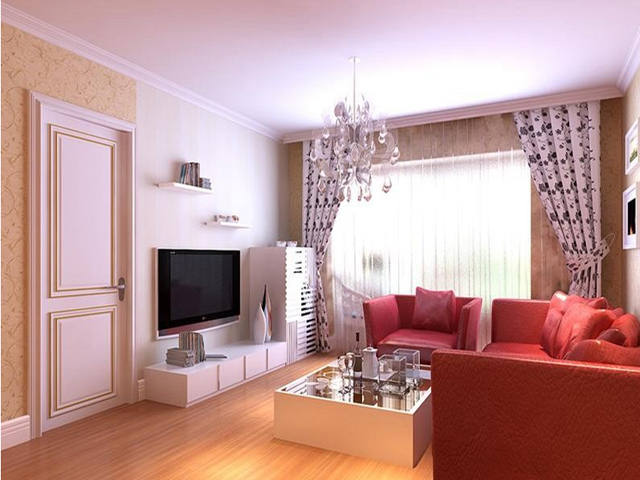 素雅大方的電視背景墻設(shè)計,白色壁架裝飾,一門為界線,旁邊墻面均有淺黃色花紋墻壁紙鋪貼,色彩對比較明顯,空間功能性區(qū)域劃分明顯,界線清晰。白色簡約電視柜搭配,純色花瓶裝飾,整個背景墻看上去清新淡雅。石膏板吊頂,晶瑩閃亮的水晶吊燈懸掛在客廳吊頂中央,白色木質(zhì)頂角線裝飾。淺黃色花紋墻壁打造的沙發(fā)背景墻,裝飾畫裝飾,美觀大方;鸺t的皮質(zhì)簡約沙發(fā),紅色靠包及靠枕裝飾,配套的沙發(fā)椅搭配,點亮的了家居色彩,補充了居室藝術(shù)氛圍,給居室打來了一抹亮麗的色彩,同時也充分體現(xiàn)出了現(xiàn)代簡約風(fēng)格的特點。實木復(fù)合地板鋪地,白色方形茶幾,玻璃鏡面桌面設(shè)計,簡潔時尚。整個家居給人的感受,溫馨舒適、時尚個性。